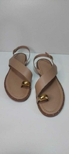 A Sandália Rasteira Douratta traz um toque de sofisticação com sua tira larga cruzada em tom nude e detalhe metálico dourado sobre o dedo.